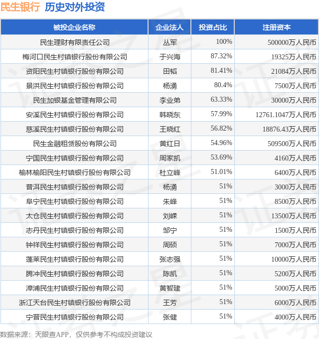 证券之星消息,根据天眼查APP显示,民生银行(600016.SH)新增一起对外投资事件,被投资公司为重庆顺博铝合金股份有限公司,法定代表人王真见,投资占比为0.96%。该公司从事有色金属冶炼和压延加工业,注册资本为66943.6061万人民币。目前,民生银行共存在对外投资197项,投资占比前20的项目见下表: