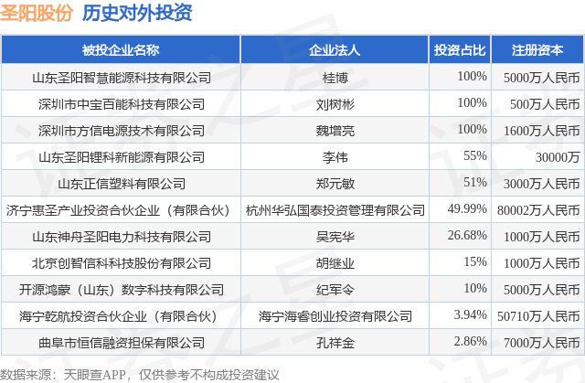 通过天眼查大数据分析,山东圣阳电源股份有限公司共对外投资了14家企业,参与招投标项目3747次;财产线索方面有商标信息38条,专利信息582条,著作权信息18条;此外企业还拥有行政许可58个。据2024年报数据,圣阳股份长期股权投资1.23亿元,同比增4176.25%。