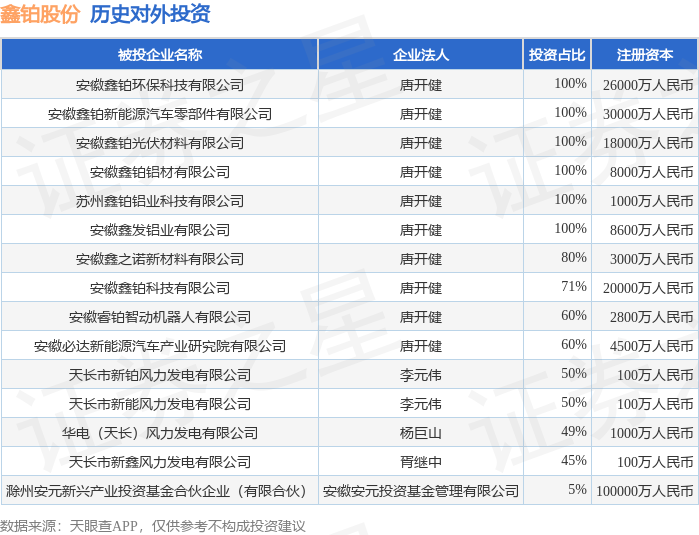 证券之星消息,根据天眼查APP显示,鑫铂股份(003038.SZ)新增一起对外投资事件,被投资公司为华电(天长)风力发电有限公司,法定代表人杨巨山,投资占比为49%。该公司从事电力、热力生产和供应业,注册资本为1000万人民币。目前,鑫铂股份共存在对外投资15项,详见下表: