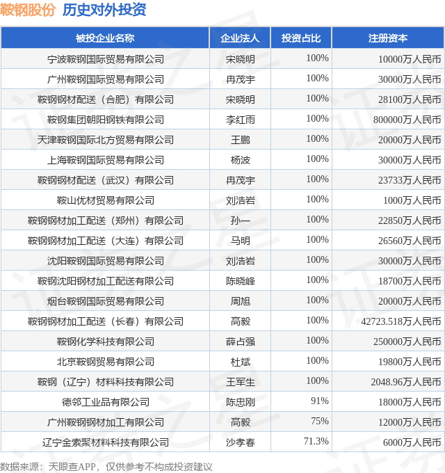 证券之星消息,根据天眼查APP显示,鞍钢股份(000898.SZ)新增一起对外投资事件,被投资公司为鞍进汽车部件(合肥)有限公司,法定代表人刘松,投资占比为51%。该公司从事汽车制造业,注册资本为1000万人民币。目前,鞍钢股份共存在对外投资45项,投资占比前20的项目见下表: