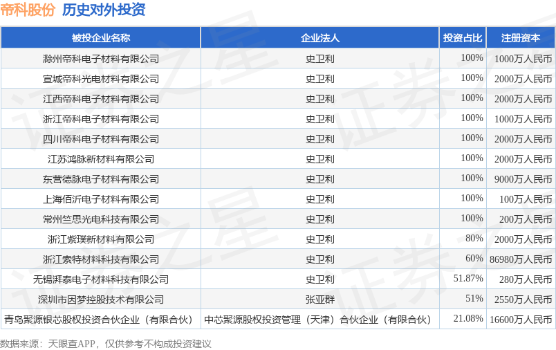 证券之星消息,根据天眼查APP显示,帝科股份(300842.SZ)新增一起对外投资事件,被投资公司为滁州帝科电子材料有限公司,法定代表人史卫利,投资占比为100%。该公司从事计算机、通信和其他电子设备制造业,注册资本为1000万人民币。目前,帝科股份共存在对外投资14项,详见下表: