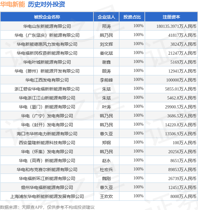 证券之星消息,根据天眼查APP显示,华电新能(600930.SH)新增一起对外投资事件,被投资公司为华电(天长)风力发电有限公司,法定代表人杨巨山,投资占比为51%。该公司从事电力、热力生产和供应业,注册资本为1000万人民币。目前,华电新能共存在对外投资553项,投资占比前20的项目见下表: