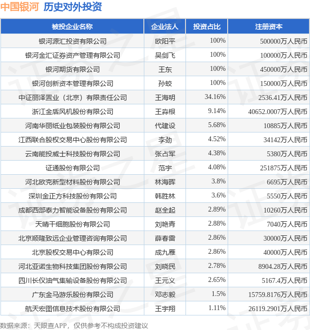 证券之星消息,根据天眼查APP显示,中国银河(601881.SH)新增一起对外投资事件,被投资公司为航天宏图信息技术股份有限公司,法定代表人王宇翔,投资占比为1.11%。该公司从事软件和信息技术服务业,注册资本为26119.2901万人民币。目前,中国银河共存在对外投资63项,投资占比前20的项目见下表: