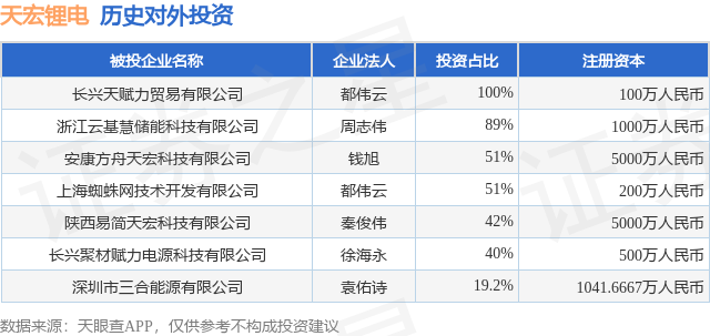 证券之星消息,根据天眼查APP显示,天宏锂电(920252.BJ)新增一起对外投资事件,被投资公司为安康方舟天宏科技有限公司,法定代表人钱旭,投资占比为51%。该公司从事科技推广和应用服务业,注册资本为5000万人民币。目前,天宏锂电共存在对外投资7项,详见下表: