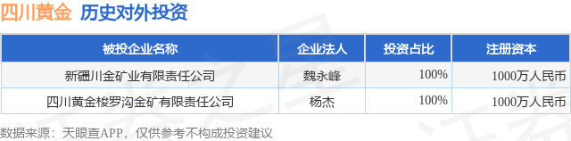 证券之星消息,根据天眼查APP显示,四川黄金(001337.SZ)新增一起对外投资事件,被投资公司为新疆川金矿业有限责任公司,法定代表人魏永峰,投资占比为100%。该公司从事有色金属矿采选业,注册资本为1000万人民币。目前,四川黄金共存在对外投资2项,详见下表: