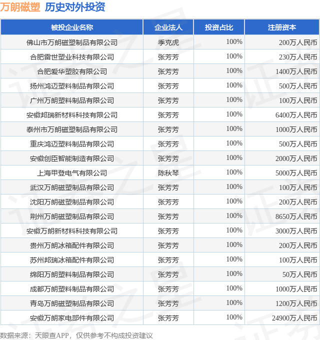 证券之星消息,根据天眼查APP显示,万朗磁塑(603150.SH)新增一起对外投资事件,被投资公司为泰州天恩电子有限公司,法定代表人张芳芳,投资占比为85%。该公司从事仪器仪表制造业,注册资本为589.8035万美元。目前,万朗磁塑共存在对外投资56项,投资占比前20的项目见下表: