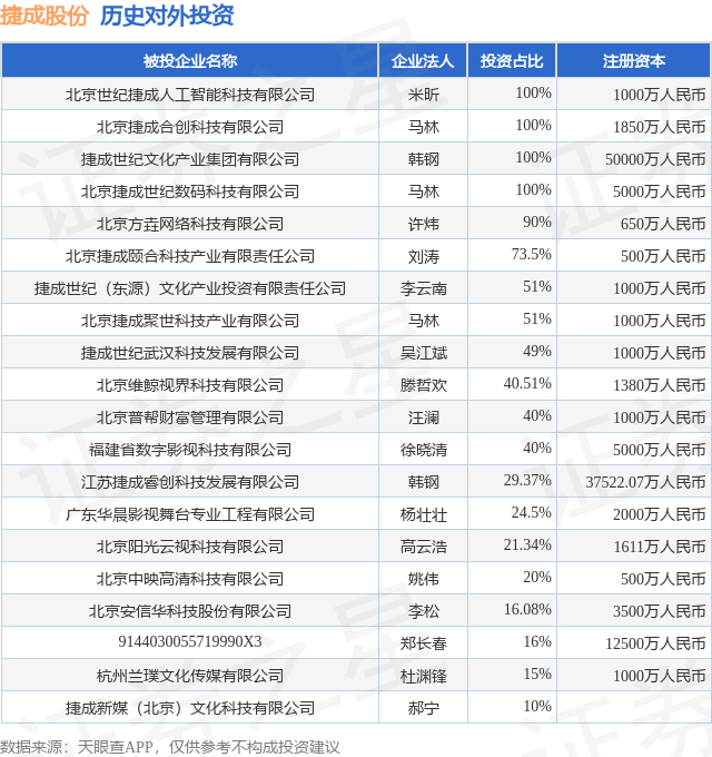 证券之星消息,根据天眼查APP显示,捷成股份(300182.SZ)新增一起对外投资事件,被投资公司为捷成新媒(北京)文化科技有限公司,法定代表人郝宁,投资占比为10%。该公司从事,注册资本为。目前,捷成股份共存在对外投资24项,投资占比前20的项目见下表: