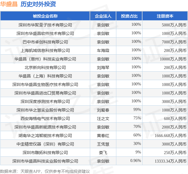 证券之星消息,根据天眼查APP显示,华盛昌(002980.SZ)新增一起对外投资事件,被投资公司为深圳市华聚量子技术有限公司,法定代表人袁剑敏,投资占比为100%。该公司从事仪器仪表制造业,注册资本为5000万人民币。目前,华盛昌共存在对外投资17项,详见下表: