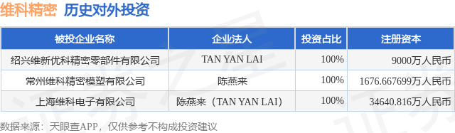 证券之星消息,根据天眼查APP显示,维科精密(301499.SZ)新增一起对外投资事件,被投资公司为绍兴维新优科精密零部件有限公司,法定代表人TAN YAN LAI,投资占比为100%。该公司从事计算机、通信和其他电子设备制造业,注册资本为9000万人民币。目前,维科精密共存在对外投资3项,详见下表: