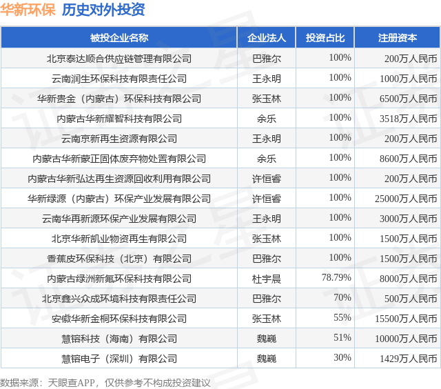 证券之星消息,根据天眼查APP显示,华新环保(301265.SZ)新增一起对外投资事件,被投资公司为北京泰达顺合供应链管理有限公司,法定代表人巴雅尔,投资占比为100%。该公司从事商务服务业,注册资本为200万人民币。目前,华新环保共存在对外投资16项,详见下表: