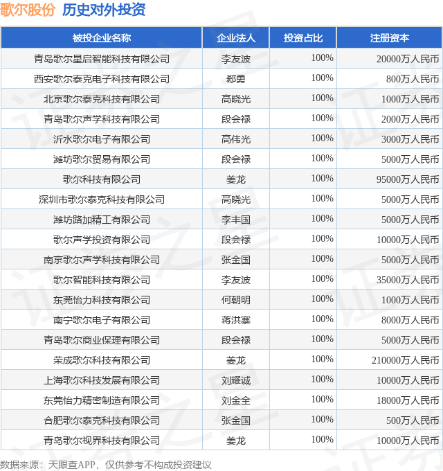 证券之星消息,根据天眼查APP显示,歌尔股份(002241.SZ)新增一起对外投资事件,被投资公司为青岛歌尔星启智能科技有限公司,法定代表人李友波,投资占比为100%。该公司从事计算机、通信和其他电子设备制造业,注册资本为20000万人民币。目前,歌尔股份共存在对外投资36项,投资占比前20的项目见下表: