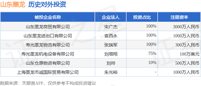 证券之星消息,根据天眼查APP显示,山东墨龙(002490.SZ)新增一起对外投资事件,被投资公司为上海墨龙币诚国际贸易有限公司,法定代表人朱光裕,投资占比为-。该公司从事批发业,注册资本为1000万人民币。目前,山东墨龙共存在对外投资6项,详见下表: