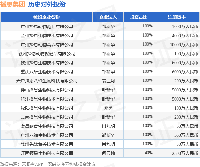 证券之星消息,根据天眼查APP显示,播恩集团(001366.SZ)新增一起对外投资事件,被投资公司为江西领晟生物科技有限公司,法定代表人何显坤,投资占比为40%。该公司从事研究和试验发展,注册资本为2500万人民币。目前,播恩集团共存在对外投资15项,详见下表: