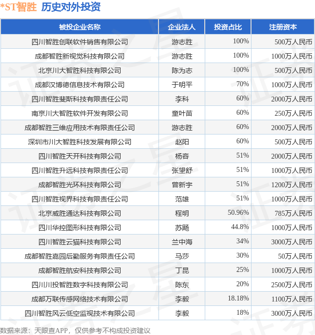 证券之星消息,根据天眼查APP显示,*ST智胜(002253.SZ)新增一起对外投资事件,被投资公司为四川智胜天开科技有限公司,法定代表人杨容,投资占比为51%。该公司从事软件和信息技术服务业,注册资本为2000万人民币。目前,*ST智胜共存在对外投资26项,投资占比前20的项目见下表: