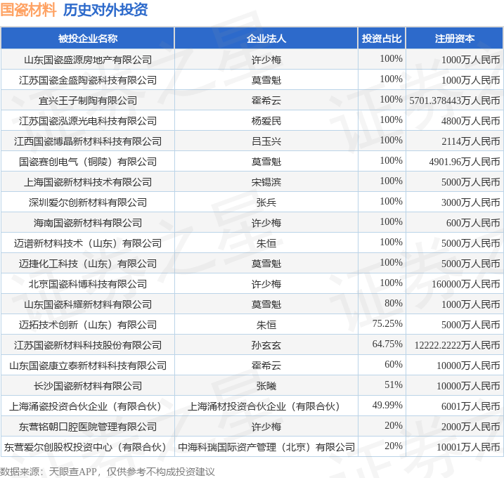 证券之星消息,根据天眼查APP显示,国瓷材料(300285.SZ)新增一起对外投资事件,被投资公司为山东国瓷盛源房地产有限公司,法定代表人许少梅,投资占比为100%。该公司从事房地产业,注册资本为1000万人民币。目前,国瓷材料共存在对外投资23项,投资占比前20的项目见下表: