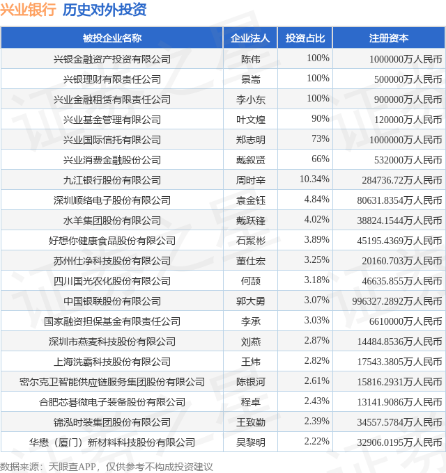 证券之星消息,根据天眼查APP显示,兴业银行(601166.SH)新增一起对外投资事件,被投资公司为兴银金融资产投资有限公司,法定代表人陈伟,投资占比为100%。该公司从事其他金融业,注册资本为1000000万人民币。目前,兴业银行共存在对外投资237项,投资占比前20的项目见下表: