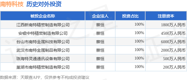 通过天眼查大数据分析,珠海市南特金属科技股份有限公司共对外投资了8家企业,参与招投标项目5次;财产线索方面有商标信息9条,专利信息63条;此外企业还拥有行政许可44个。