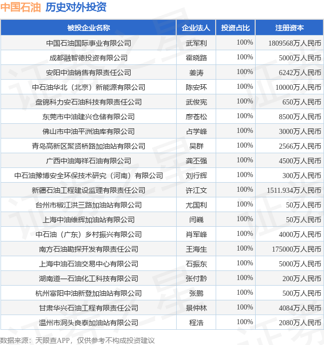 证券之星消息,根据天眼查APP显示,中国石油(601857.SH)新增一起对外投资事件,被投资公司为毕节市德溪石油销售有限公司,法定代表人詹丹,投资占比为70%。该公司从事零售业,注册资本为1600万人民币。目前,中国石油共存在对外投资1069项,投资占比前20的项目见下表: