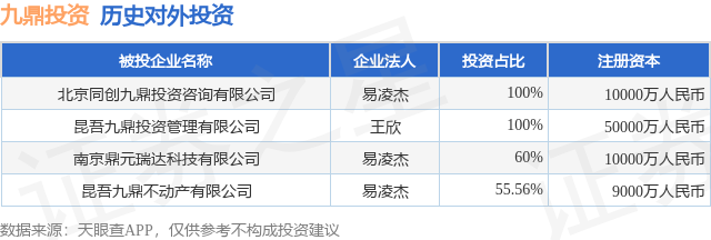 证券之星消息,根据天眼查APP显示,九鼎投资(600053.SH)新增一起对外投资事件,被投资公司为南京鼎元瑞达科技有限公司,法定代表人易凌杰,投资占比为60%。该公司从事软件和信息技术服务业,注册资本为10000万人民币。目前,九鼎投资共存在对外投资4项,详见下表: