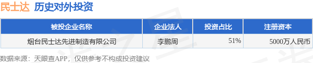 证券之星消息,根据天眼查APP显示,民士达(920394.BJ)新增一起对外投资事件,被投资公司为烟台民士达先进制造有限公司,法定代表人李鹏周,投资占比为51%。该公司从事其他制造业,注册资本为5000万人民币。目前,民士达共存在对外投资1项,详见下表: