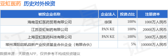 证券之星消息,根据天眼查APP显示,亚虹医药(688176.SH)新增一起对外投资事件,被投资公司为常州溧阳启帆战新产业投资基金合伙企业(有限合伙),法定代表人,投资占比为5%。该公司从事资本市场服务,注册资本为100000万人民币。目前,亚虹医药共存在对外投资4项,详见下表: