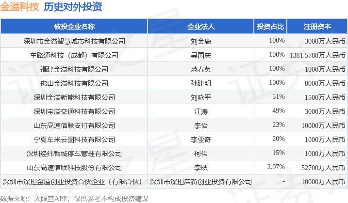 证券之星消息,根据天眼查APP显示,金溢科技(002869.SZ)新增一起对外投资事件,被投资公司为深圳金溢新能科技有限公司,法定代表人刘咏平,投资占比为51%。该公司从事研究和试验发展,注册资本为1500万人民币。目前,金溢科技共存在对外投资11项,详见下表: