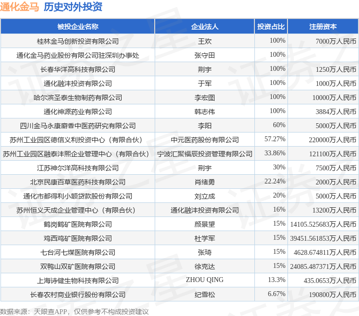 证券之星消息,根据天眼查APP显示,通化金马(000766.SZ)新增一起对外投资事件,被投资公司为桂林金马创新投资有限公司,法定代表人王欢,投资占比为100%。该公司从事资本市场服务,注册资本为7000万人民币。目前,通化金马共存在对外投资19项,详见下表: