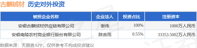 证券之星消息,根据天眼查APP显示,古麒绒材(001390.SZ)新增一起对外投资事件,被投资公司为安徽古麒绒材供应链有限公司,法定代表人谢伟,投资占比为100%。该公司从事多式联运和运输代理业,注册资本为1000万人民币。目前,古麒绒材共存在对外投资2项,详见下表: