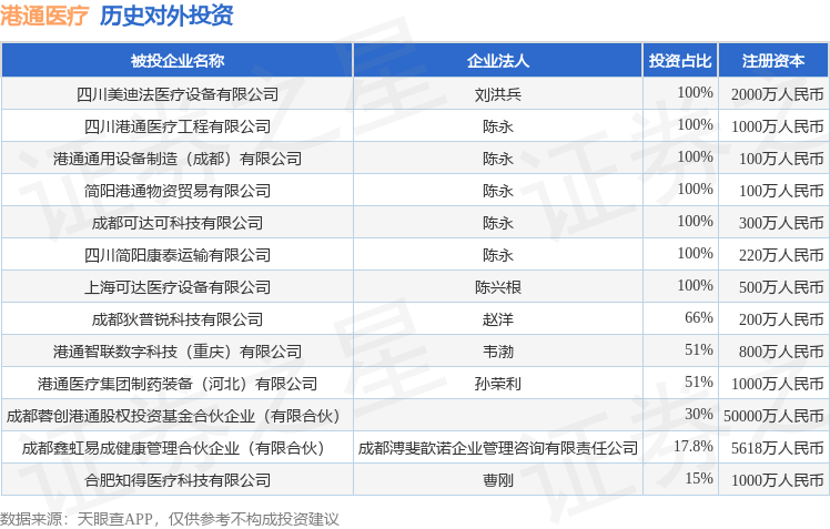 证券之星消息,根据天眼查APP显示,港通医疗(301515.SZ)新增一起对外投资事件,被投资公司为成都蓉创港通股权投资基金合伙企业(有限合伙),法定代表人,投资占比为30%。该公司从事资本市场服务,注册资本为50000万人民币。目前,港通医疗共存在对外投资13项,详见下表: