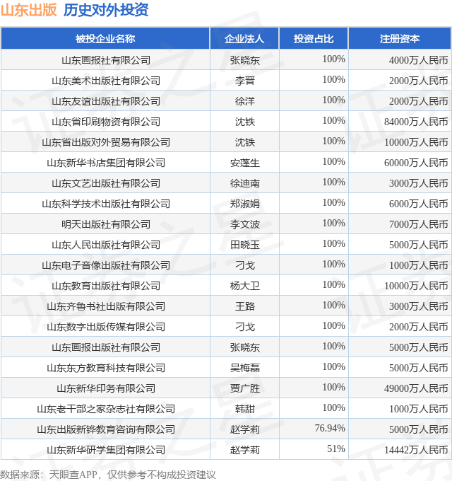 通过天眼查大数据分析,山东出版传媒股份有限公司共对外投资了28家企业,参与招投标项目182次;财产线索方面有商标信息1条,著作权信息7条;此外企业还拥有行政许可9个。据2024年报数据,山东出版长期股权投资4916.18万元,同比减1.43%。