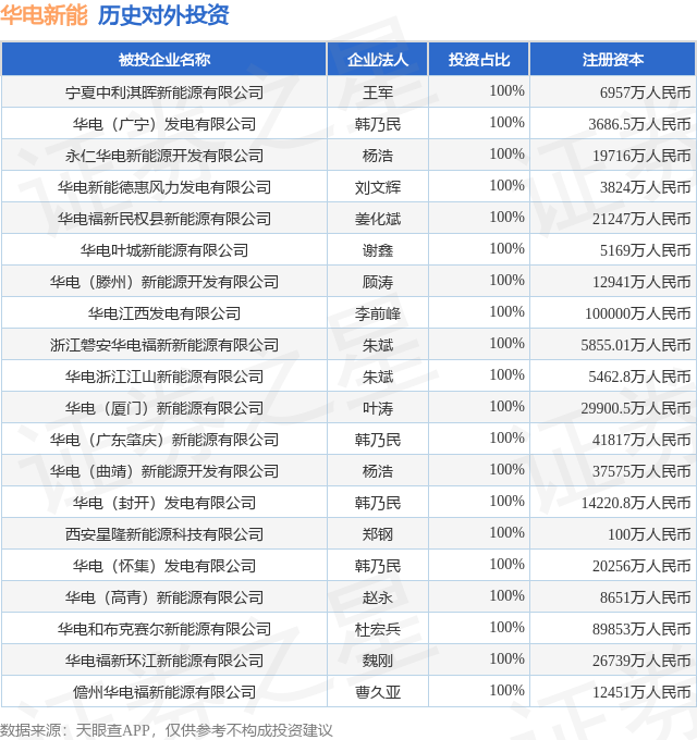 证券之星消息,根据天眼查APP显示,华电新能(600930.SH)新增一起对外投资事件,被投资公司为华电(夏津)新能源有限公司,法定代表人张栋栋,投资占比为90%。该公司从事电力、热力生产和供应业,注册资本为1000万人民币。目前,华电新能共存在对外投资556项,投资占比前20的项目见下表: