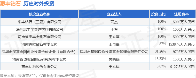 证券之星消息,根据天眼查APP显示,惠丰钻石(920725.BJ)新增一起对外投资事件,被投资公司为深圳市深基宏图创业投资合伙企业(有限合伙),法定代表人深圳市基础设施投资基金管理有限责任公司,投资占比为31.26%。该公司从事资本市场服务,注册资本为9795万人民币。目前,惠丰钻石共存在对外投资7项,详见下表: