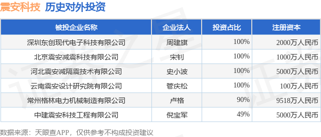 证券之星消息,根据天眼查APP显示,震安科技(300767.SZ)新增一起对外投资事件,被投资公司为深圳东创现代电子科技有限公司,法定代表人周建旗,投资占比为100%。该公司从事计算机、通信和其他电子设备制造业,注册资本为2000万人民币。目前,震安科技共存在对外投资6项,详见下表: