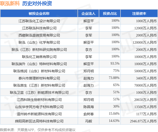 证券之星消息,根据天眼查APP显示,联泓新科(003022.SZ)新增一起对外投资事件,被投资公司为泰兴市普理新材料有限公司,法定代表人赵海力,投资占比为73.88%。该公司从事科技推广和应用服务业,注册资本为3400万人民币。目前,联泓新科共存在对外投资15项,详见下表: