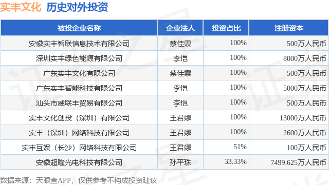 证券之星消息,根据天眼查APP显示,实丰文化(002862.SZ)新增一起对外投资事件,被投资公司为安徽实丰智联信息技术有限公司,法定代表人蔡佳霖,投资占比为100%。该公司从事软件和信息技术服务业,注册资本为500万人民币。目前,实丰文化共存在对外投资9项,详见下表: