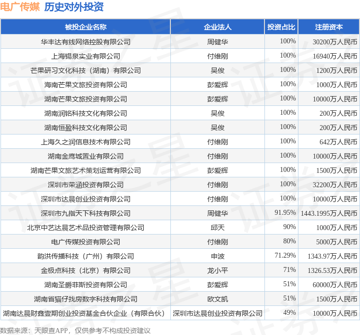 证券之星消息,根据天眼查APP显示,电广传媒(000917.SZ)新增一起对外投资事件,被投资公司为湖南省猫仔找房数字科技有限公司,法定代表人欧文凯,投资占比为51%。该公司从事软件和信息技术服务业,注册资本为1500万人民币。目前,电广传媒共存在对外投资52项,投资占比前20的项目见下表:
