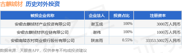 证券之星消息,根据天眼查APP显示,古麒绒材(001390.SZ)新增一起对外投资事件,被投资公司为安徽古麒绒材产业投资有限公司,法定代表人谢玉成,投资占比为100%。该公司从事资本市场服务,注册资本为3000万人民币。目前,古麒绒材共存在对外投资3项,详见下表: