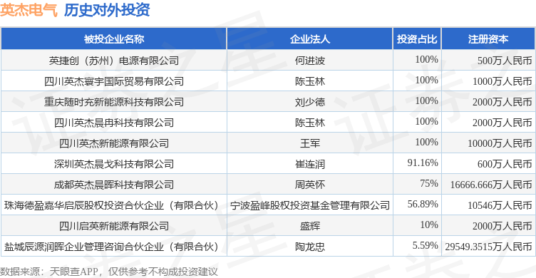 证券之星消息,根据天眼查APP显示,英杰电气(300820.SZ)新增一起对外投资事件,被投资公司为四川启英新能源有限公司,法定代表人盛辉,投资占比为10%。该公司从事电力、热力生产和供应业,注册资本为2000万人民币。目前,英杰电气共存在对外投资10项,详见下表:
