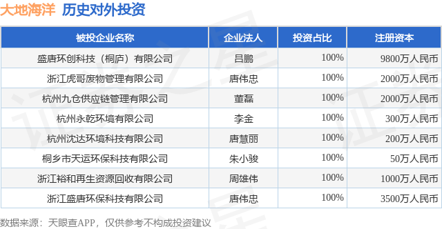 证券之星消息,根据天眼查APP显示,大地海洋(301068.SZ)新增一起对外投资事件,被投资公司为盛唐环创科技(桐庐)有限公司,法定代表人吕鹏,投资占比为100%。该公司从事废弃资源综合利用业,注册资本为9800万人民币。目前,大地海洋共存在对外投资8项,详见下表: