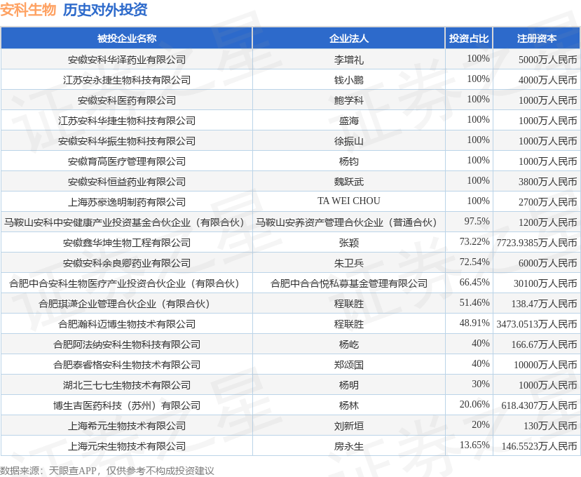 证券之星消息,根据天眼查APP显示,安科生物(300009.SZ)新增一起对外投资事件,被投资公司为安徽安科华泽药业有限公司,法定代表人李增礼,投资占比为100%。该公司从事医药制造业,注册资本为5000万人民币。目前,安科生物共存在对外投资21项,投资占比前20的项目见下表: