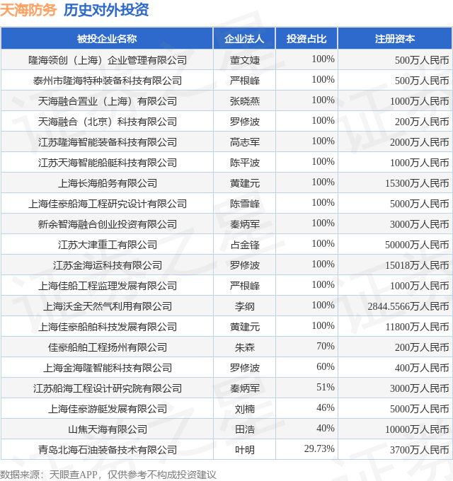 证券之星消息,根据天眼查APP显示,天海防务(300008.SZ)新增一起对外投资事件,被投资公司为上海佳豪新能船舶科技有限公司,法定代表人刘超,投资占比为-。该公司从事铁路、船舶、航空航天和其他运输设备制造业,注册资本为500万人民币。目前,天海防务共存在对外投资33项,投资占比前20的项目见下表: