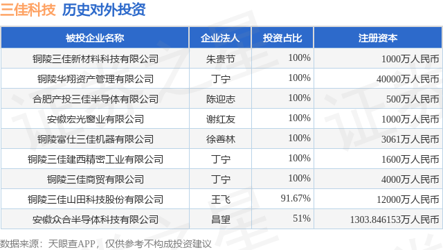 证券之星消息,根据天眼查APP显示,三佳科技(600520.SH)新增一起对外投资事件,被投资公司为铜陵三佳新材料科技有限公司,法定代表人朱贵节,投资占比为100%。该公司从事科技推广和应用服务业,注册资本为1000万人民币。目前,三佳科技共存在对外投资9项,详见下表: