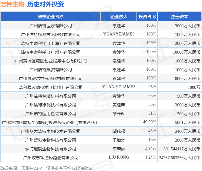 证券之星消息,根据天眼查APP显示,洁特生物(688026.SH)新增一起对外投资事件,被投资公司为洁科膜过滤技术(杭州)有限公司,法定代表人YUAN YE JAMES,投资占比为95%。该公司从事专用设备制造业,注册资本为1000万。目前,洁特生物共存在对外投资16项,详见下表: