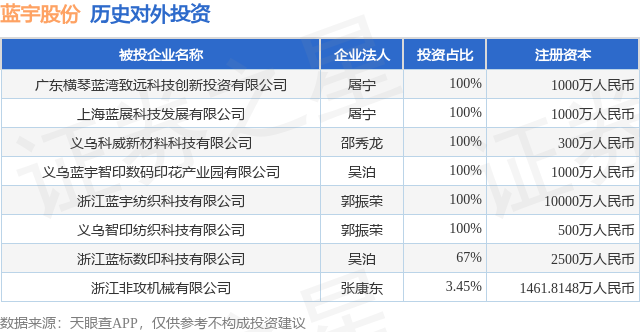 证券之星消息,根据天眼查APP显示,蓝宇股份(301585.SZ)新增一起对外投资事件,被投资公司为浙江非攻机械有限公司,法定代表人张康东,投资占比为3.45%。该公司从事专用设备制造业,注册资本为1461.8148万人民币。目前,蓝宇股份共存在对外投资8项,详见下表:
