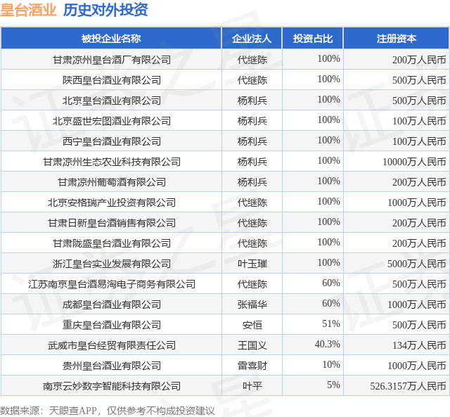 通过天眼查大数据分析,甘肃皇台酒业股份有限公司共对外投资了19家企业,参与招投标项目5次;财产线索方面有商标信息161条,专利信息60条;此外企业还拥有行政许可23个。