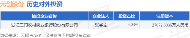 证券之星消息,根据天眼查APP显示,元创股份(001325.SZ)新增一起对外投资事件,被投资公司为浙江三门农村商业银行股份有限公司,法定代表人张学定,投资占比为5.03%。该公司从事货币金融服务,注册资本为27672.8036万人民币。目前,元创股份共存在对外投资1项,详见下表: