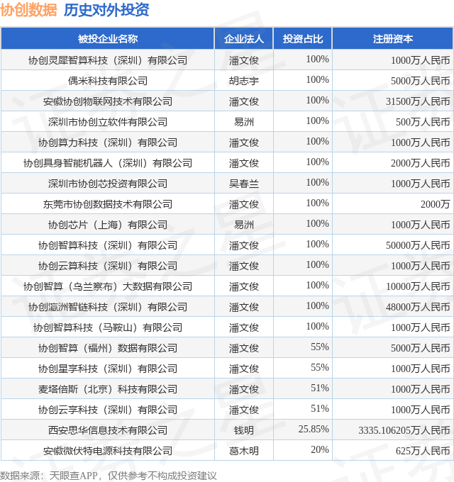 证券之星消息,根据天眼查APP显示,协创数据(300857.SZ)新增一起对外投资事件,被投资公司为协创灵犀智算科技(深圳)有限公司,法定代表人潘文俊,投资占比为100%。该公司从事软件和信息技术服务业,注册资本为1000万人民币。目前,协创数据共存在对外投资24项,投资占比前20的项目见下表:
