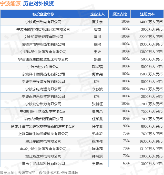 证券之星消息,根据天眼查APP显示,宁波能源(600982.SH)新增一起对外投资事件,被投资公司为宁波神骥能源科技有限公司,法定代表人郭芬,投资占比为15%。该公司从事科技推广和应用服务业,注册资本为5000万人民币。目前,宁波能源共存在对外投资46项,投资占比前20的项目见下表:
