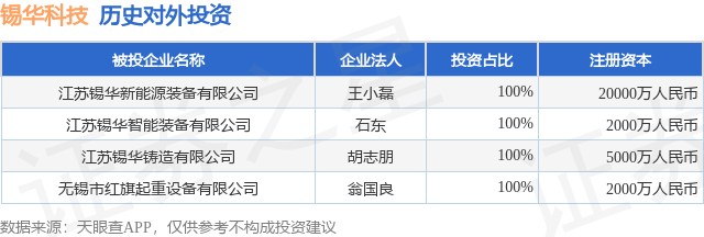 证券之星消息,根据天眼查APP显示,锡华科技(603248.SH)新增一起对外投资事件,被投资公司为江苏锡华新能源装备有限公司,法定代表人王小磊,投资占比为100%。该公司从事电气机械和器材制造业,注册资本为20000万人民币。目前,锡华科技共存在对外投资4项,详见下表: