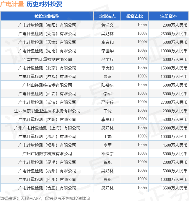 证券之星消息,根据天眼查APP显示,广电计量(002967.SZ)新增一起对外投资事件,被投资公司为广电计量检测(衡阳)有限公司,法定代表人黄沃文,投资占比为100%。该公司从事专业技术服务业,注册资本为2000万人民币。目前,广电计量共存在对外投资32项,投资占比前20的项目见下表: